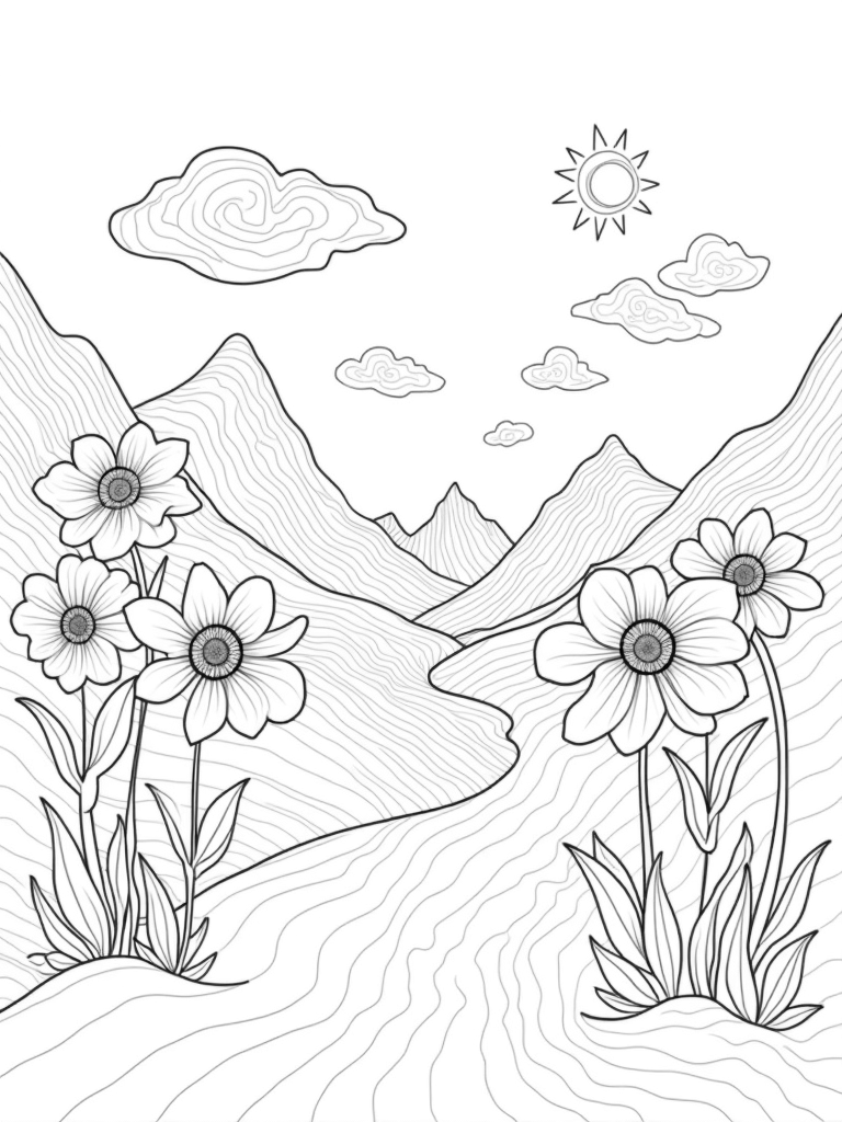 Rolling Landscape with Oversized Flowers and Ink River Coloring Page