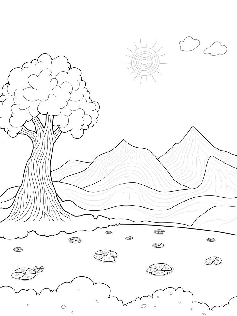 Serene Hills with a Majestic Tree and Tranquil Lake Coloring Page