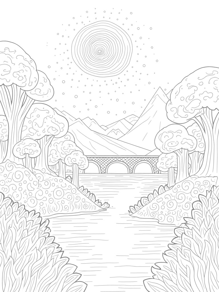This scene is all about nature's beauty! Picture undulating hills covered in fun patterns of wildflowers and leaves. Towering trees twist upwards with spiral trunks, and their canopies create cool geometric shapes that stand out against the sky. In front, a peaceful lake mirrors the vibrant colors of a huge sun, filled with swirling lines and dots. There's even a charming stone bridge arching over the water, leading your eyes toward a distant mountain range with jagged peaks and fluffy clouds above.