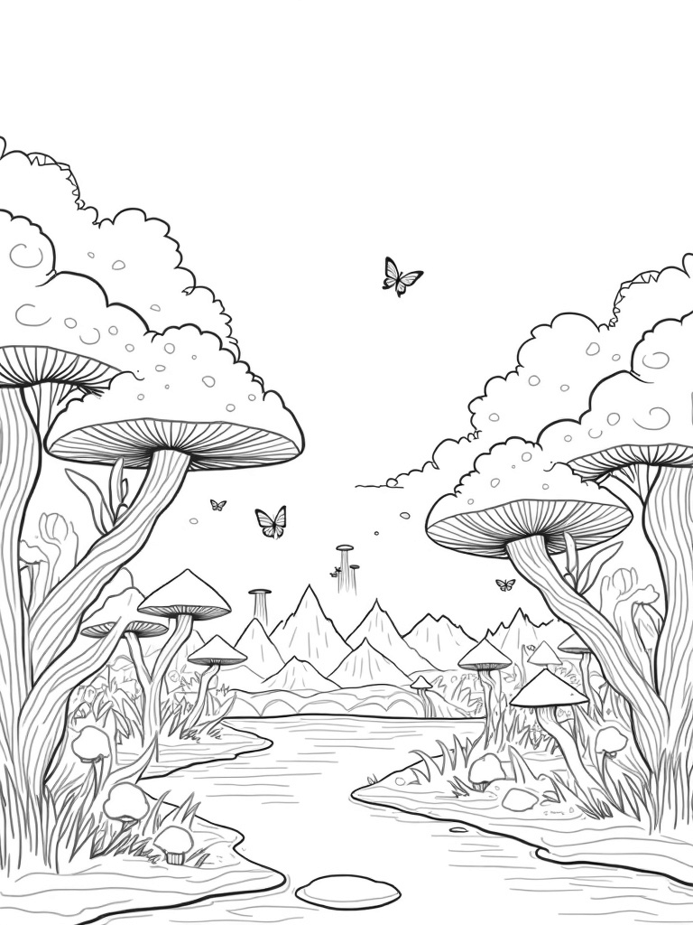 Check out this free, printable coloring page featuring a stunning landscape with spiraling trees, colorful butterflies, and whimsical mushrooms. Perfect for kids who love to color and explore nature's beauty!
