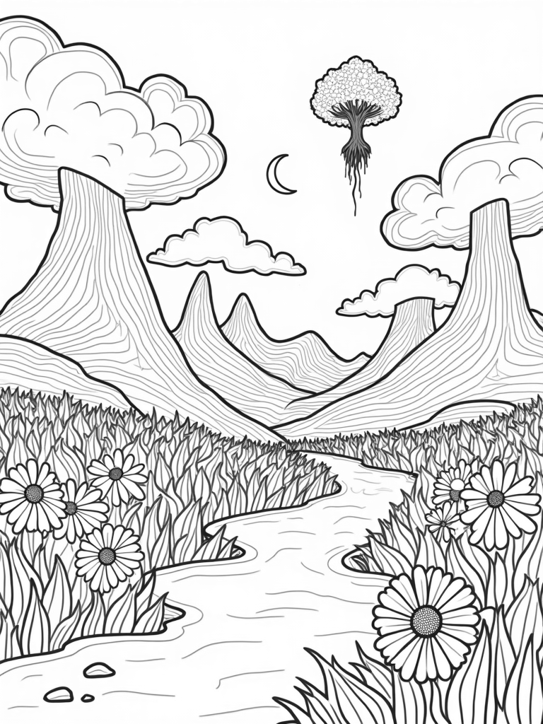 Check out this free, printable coloring page featuring a whimsical landscape with swirling clouds, a rainbow river, and oversized flowers. Perfect for kids who love nature and imagination—get ready to color your own magical world!