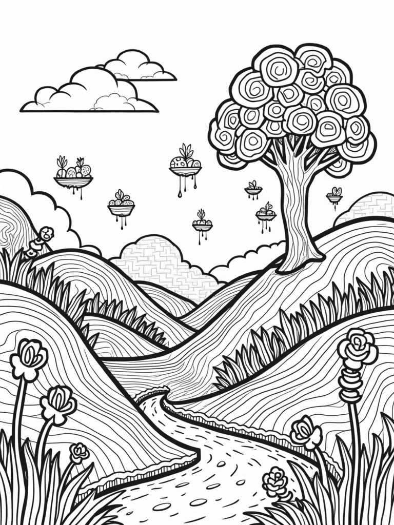 This coloring page showcases a magical landscape filled with rolling hills splashed in vibrant, swirling patterns. In the foreground, you'll see oversized flowers with spiraled petals, their stems playfully twisting around each other like vines. A winding river flows through this enchanting scene, bordered by geometric rocks that look like colorful puzzle pieces.