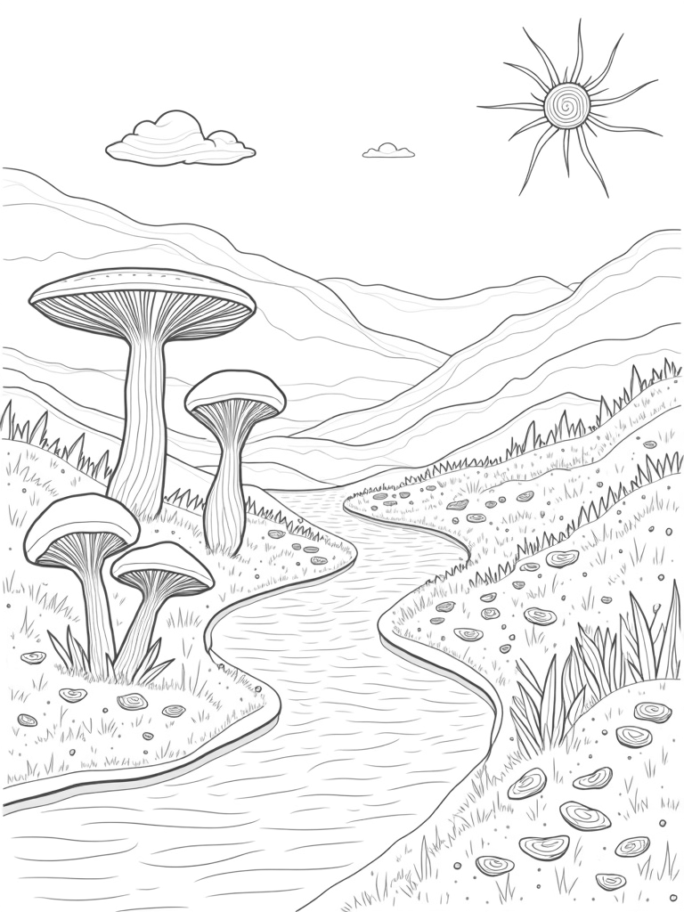 This scene is all about imagination! The hillside is alive with gigantic mushrooms that look like they're straight out of a fairy tale. They tower over the landscape, inviting you to color them in any shade you can think of. In the foreground, a winding river made of patterned stones sparkles under the sun, making it look like a magical pathway.