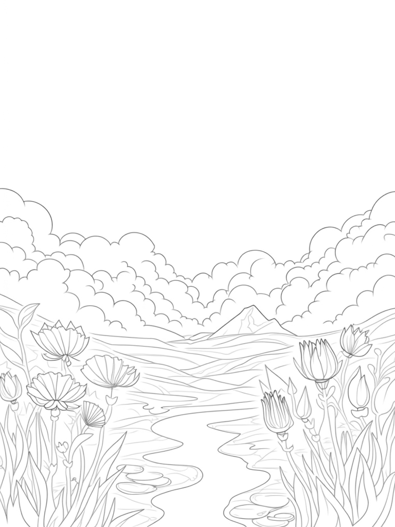 Check out this free, printable coloring page featuring a whimsical landscape filled with giant clouds, oversized flowers, and a winding river. Perfect for kids who love to color and explore nature!