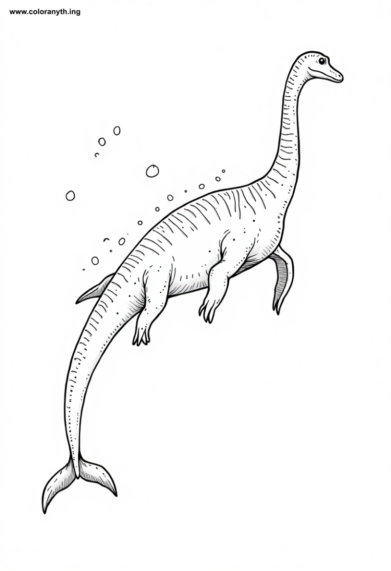 Color your own stunning scene featuring the Plesiosaurus, a prehistoric marine reptile, gracefully swimming through the ocean with bubbles around it. Bring this majestic creature to life with your artistic flair!