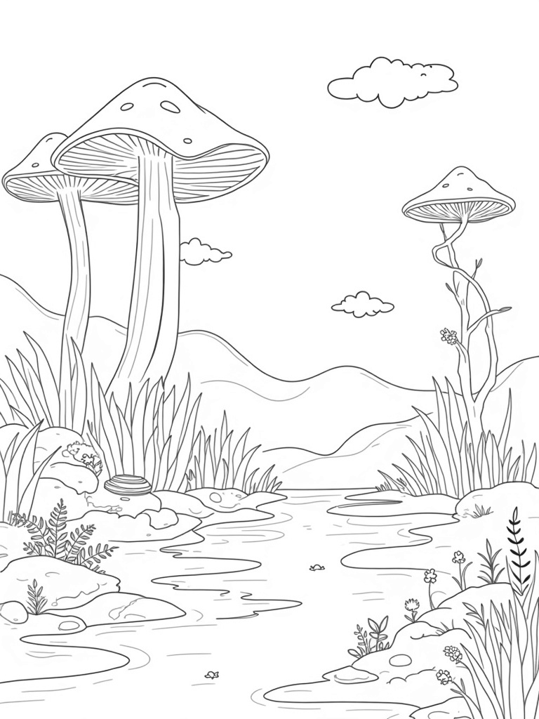 Check out this free, printable coloring page featuring a tranquil forest glade with colossal mushrooms and whimsical clouds. Perfect for kids who love nature, this coloring page will inspire creativity and fun!