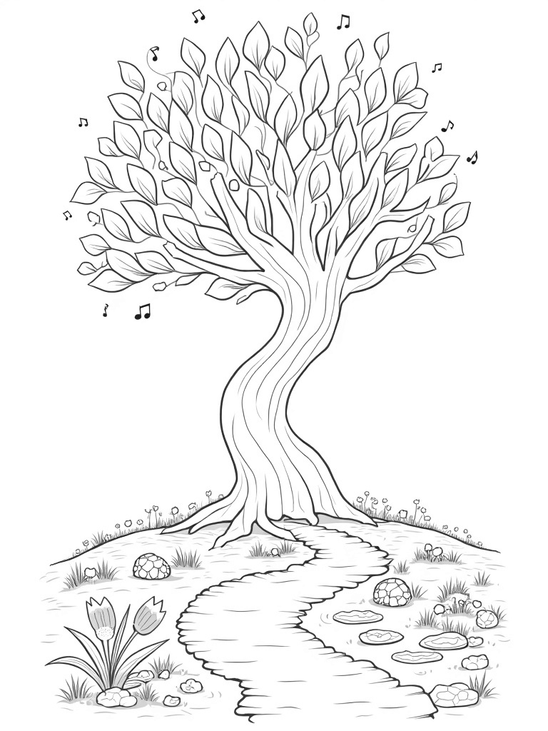 This coloring page showcases a massive tree with a trunk that spirals up like a corkscrew. Its branches are filled with oversized, glowing leaves shaped like musical notes, creating a magical atmosphere. Up in the boughs, you’ll spot clusters of glowing orbs that look just like fireflies, giving everything a soft, twinkling light.