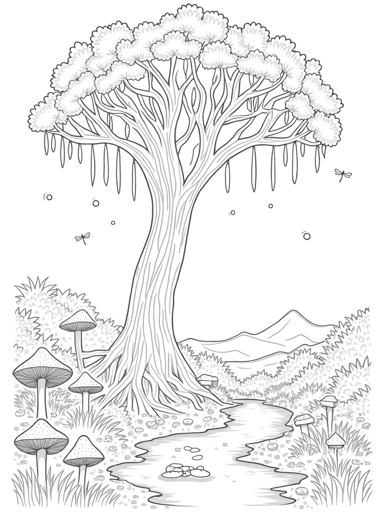 Crystal Tree with Colorful Leaves and Mushrooms Coloring Page