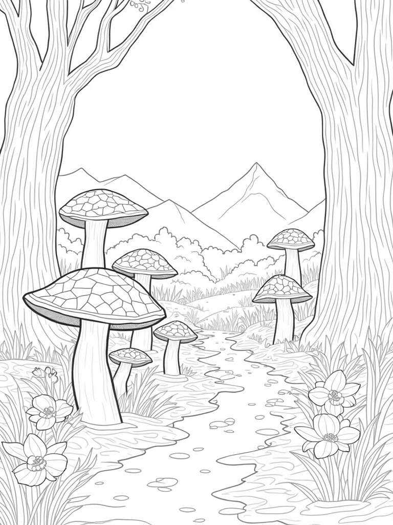 As you color, don't forget to notice the towering trees reaching up high with their intricate bark designs. They seem to tell a story of their own. In the background, a mountain silhouette adds a dramatic touch to this serene landscape, creating a perfect backdrop for your creativity. And let’s not forget the vibrant flowers scattered throughout, each petal shaped like a different geometric figure, inviting you to explore your favorite colors!