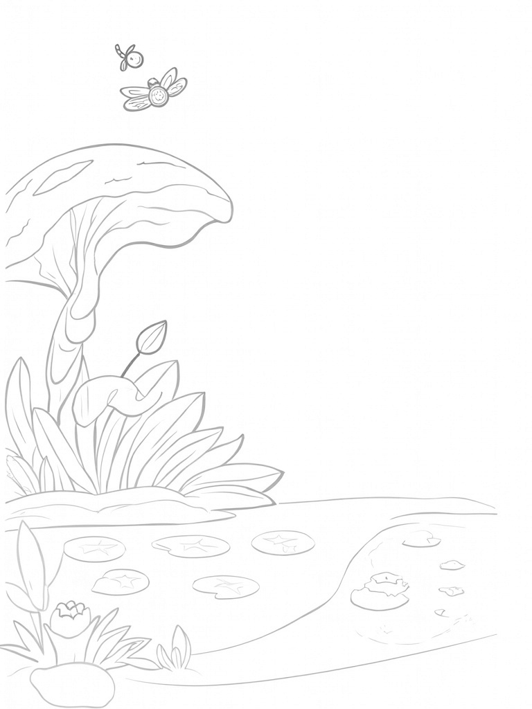 A serene pond nearby reflects the sky, surrounded by delightful lily pads shaped like twinkling stars. Delicate dragonflies with intricate wings hover gracefully above the water, adding to the enchanting atmosphere. And don’t forget the winding pathway made of smooth stones that leads through the lush foliage, perfect for exploring and letting your imagination run wild.