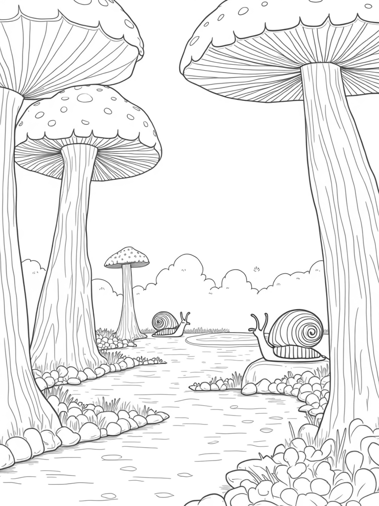 Check out this free, printable coloring page featuring a whimsical forest glade filled with oversized mushrooms, a serene pond, and a giant snail. Perfect for nature lovers and little artists alike!