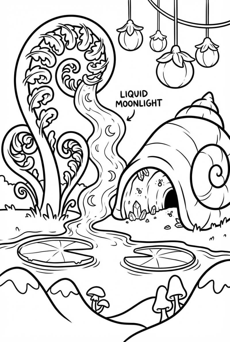 Look at this scene – a giant fern spreads its fronds like a sail catching a shimmering river of moonlight that winds between two floating lily pads. Over the water, a massive snail‑shell mountain twists upward, its spiral opening up to a hidden crystal cave where tiny fireflies glow like lanterns. Up above, a handful of seed pods drift lazily, throwing soft shadows across the emerald valley. All the lines are bold and playful, so kids can easily fill in the shapes with their favorite colors.