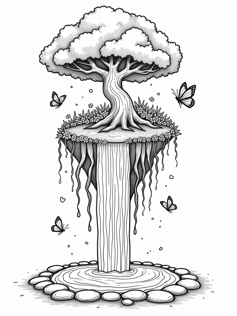 Floating Island with Giant Tree and Waterfall Coloring Page