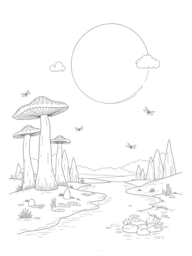 Check out this free, printable coloring page featuring a serene nature scene with a flower-shaped sun, colorful mushrooms, and a winding river. Perfect for kids who love to color and explore the beauty of the outdoors!