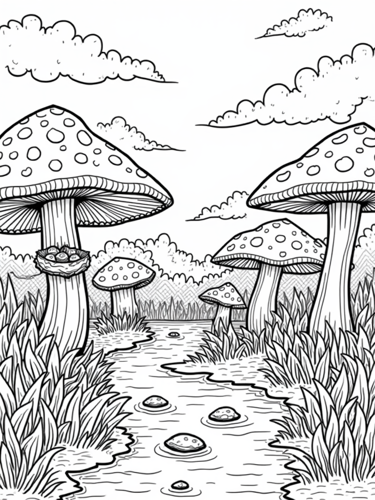 Giant Mushrooms and Playful Fish in the Forest Coloring Page