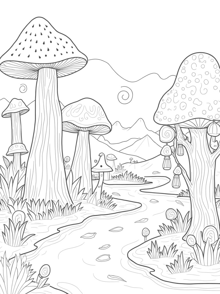 This scene is all about a magical forest filled with enormous mushrooms that look like they could touch the sky! Their caps have beautiful, intricate patterns just waiting for your favorite colors. Underneath these giants, a winding river flows, where you can spot smooth stones and shimmering fish swimming around. On one side of the river, you’ll find oversized flowers with petals that twist and curl, adding to the enchantment of the place.