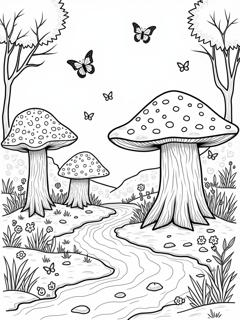 Magical Forest Clearing with Butterflies and Mushrooms Coloring Page