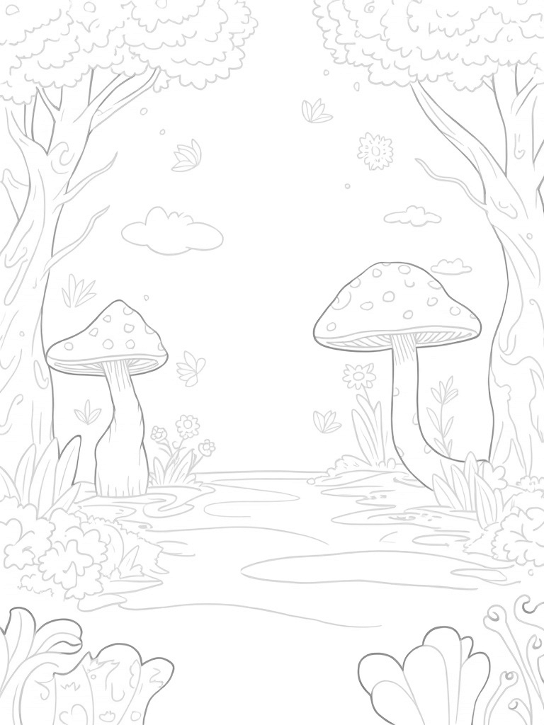 Magical Forest Clearing with Giant Mushrooms and a Sparkling Pond Coloring Page