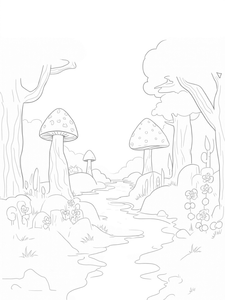 In this enchanting scene, oversized mushrooms reach for the sky, their colorful caps adorned with fun patterns just waiting for your creative touch. A winding stream flows through the clearing, its banks lined with smooth pebbles and delicate ferns that add a touch of whimsy. Imagine all the little creatures that might call this place home!
