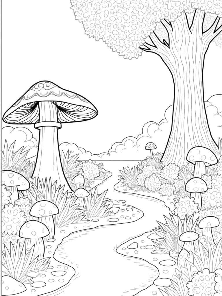 Magical Forest with Giant Mushrooms and a Winding River Coloring Page