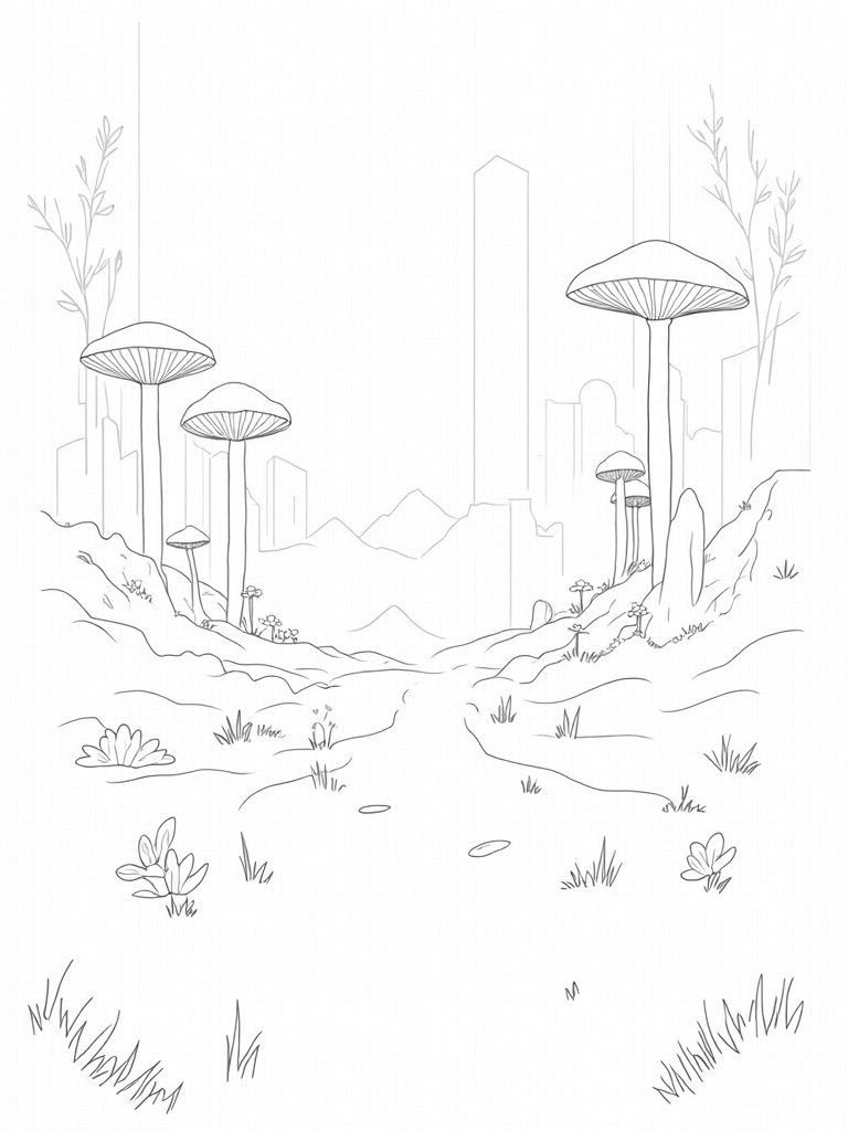 This coloring page invites you to unleash your creativity while learning about the amazing details of nature. The oversized leaves and unique mushrooms are not just fun to color; they remind us of the beauty found in the wilderness. And don’t forget the majestic mountains peeking through the mist in the background—perfect for adding your own artistic flair!