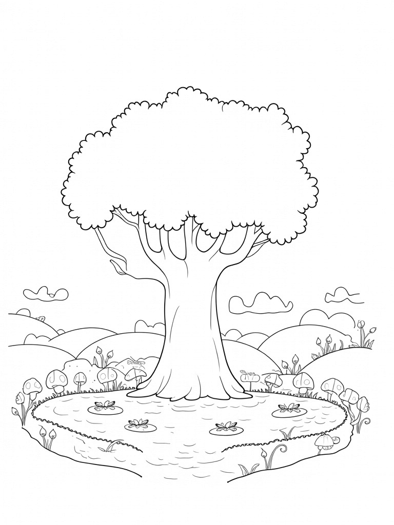 Majestic Tree with Colorful Mushrooms and a Winding River Coloring Page