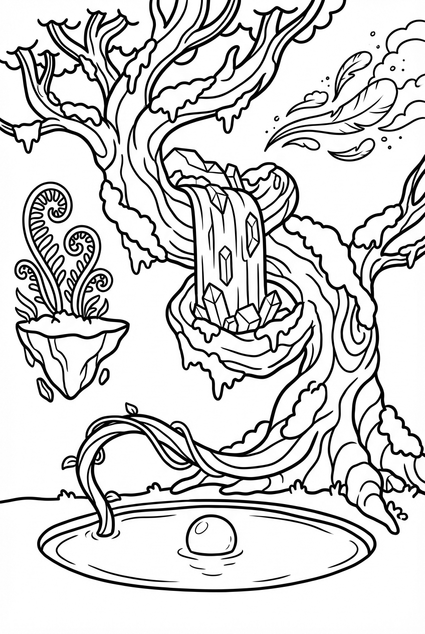 Look at that massive moss‑covered tree, its gnarled limbs holding a sparkling crystal waterfall that seems to tumble forever. Right beside the fall, a floating island drifts, planted with giant ferns that look like oversized fern fronds from a fairy tale. A long, snake‑like vine arches over a calm, mirrored pond, and the surface catches the glow of a silver moonstone sitting at its center. Up above, lazy clouds of pollen drift like soft feathers, giving the whole scene a dreamy, almost magical feel. All the lines are bold and clean, so it’s easy for little hands to stay inside the shapes.