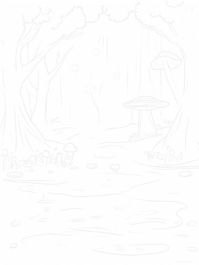 Mushroom Canopy and Shimmering River in a Forest Glade Coloring Page