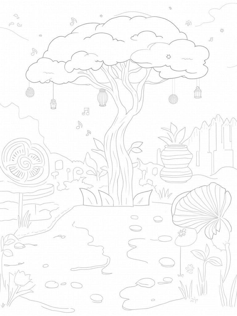 This coloring page showcases a vibrant garden filled with oversized, spiraling flowers that look like musical notes! Right in the center stands a giant tree with a wonderfully twisted trunk and unique geometric leaves. Its branches are draped with colorful lanterns that add a magical touch. Beneath this impressive tree lies a serene pond, where lily pads float peacefully, reflecting the beauty above.