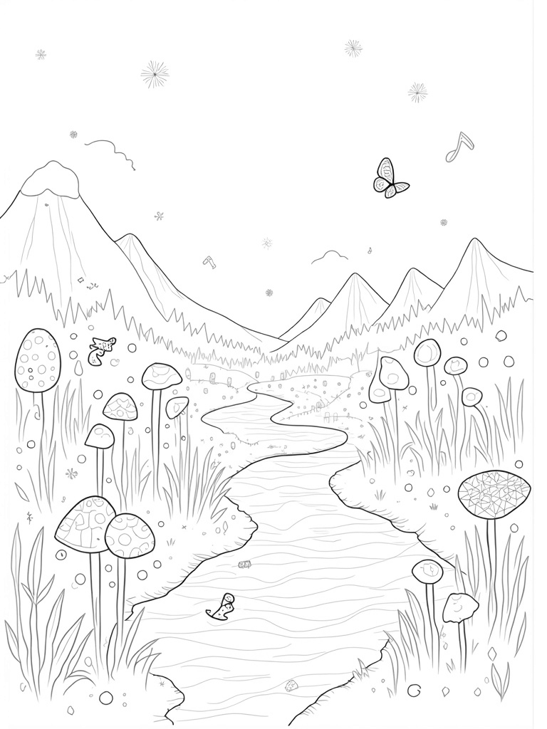On the riverbanks, you’ll see towering mushrooms with cool patterns, almost like they’re wearing their own artwork! Keep an eye out for a butterfly with kaleidoscopic wings fluttering around delicate, spiraling vines. It’s a colorful little world where everything seems to come alive with creativity.