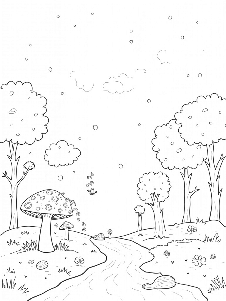 You’ll find a magical forest where trees twist and turn like spiraled vines, and their leaves dance in the shape of musical notes. Right in the foreground, a giant polka-dotted mushroom makes the perfect cozy spot for a bunch of tiny, glowing fireflies. Can you imagine how lovely it must be to sit there with them buzzing around?