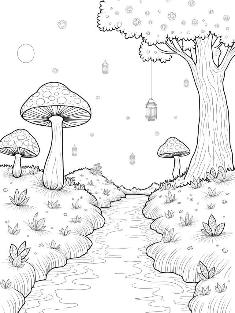 Check out this free, printable coloring page featuring a nature scene with oversized mushrooms, a gentle stream, and a majestic tree. It's perfect for kids who love to color and let their creativity shine in the great outdoors!