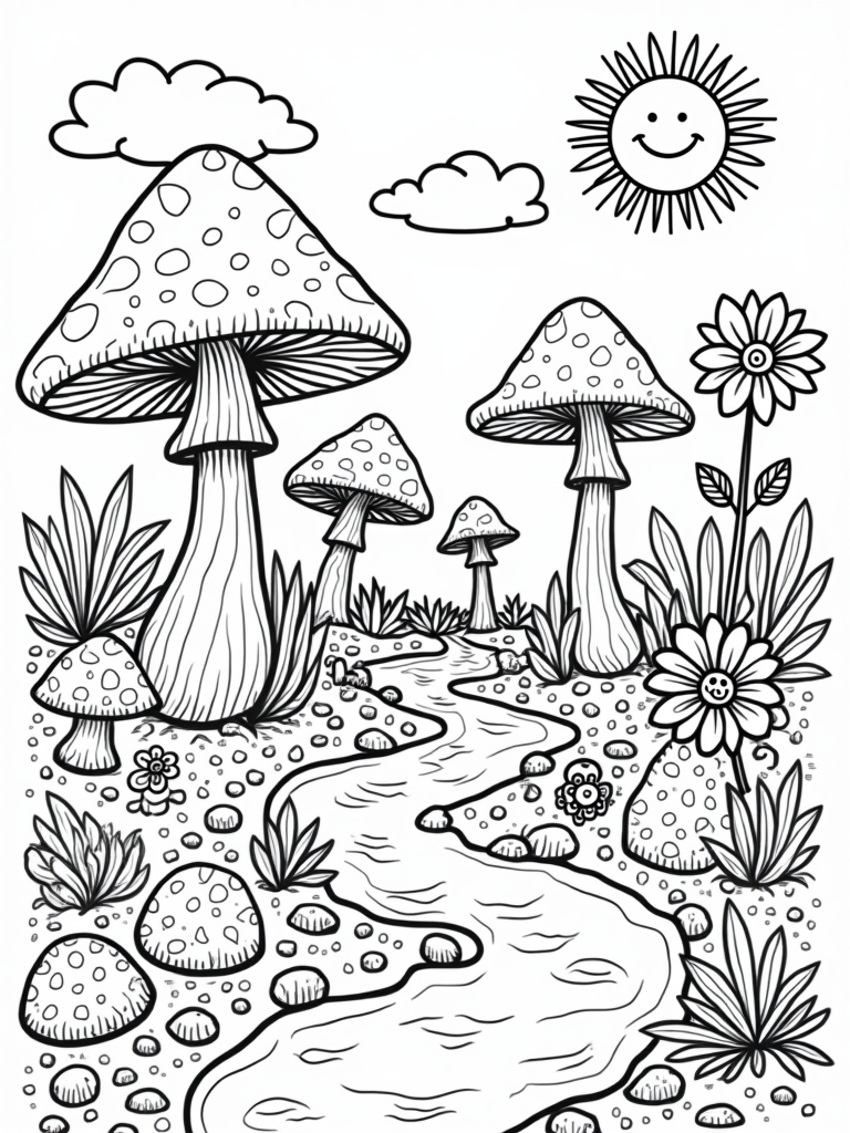 This illustration is a great way to spark creativity in kids. The mushrooms and flowers invite imaginative colors, and the smiling sun and fluffy clouds can brighten up any coloring session. Plus, the winding path and playful bridges made of stones give kids plenty to think about as they choose their colors. It’s a fantastic way to encourage artistic expression while having fun!
