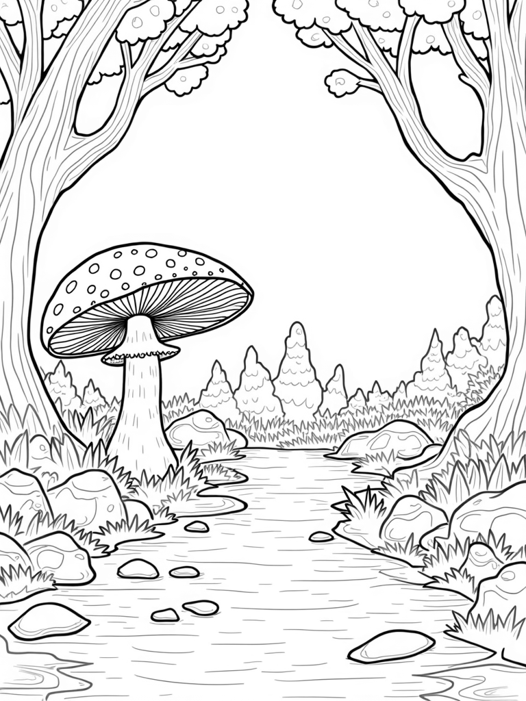 Serene Woodland Glade with Giant Mushroom and Whimsical Rocks Coloring Page
