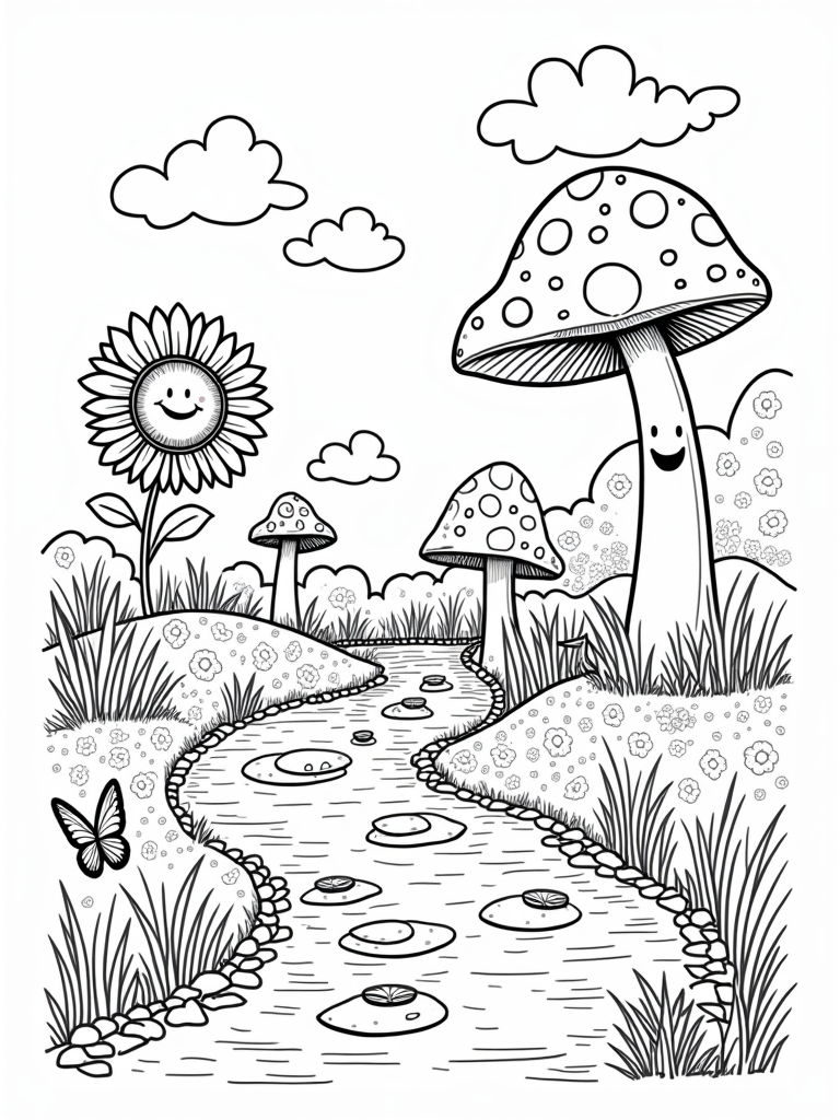 This colorful scene is all about fun and imagination! Picture a forest clearing filled with oversized mushrooms that have the sweetest smiles. Each mushroom has its own vibrant pattern, just waiting for you to bring them to life with your favorite colors. A winding path made of colorful pebbles leads to a sparkling pond, where lily pads drift like tiny boats. It’s the perfect spot to let your creativity flow!