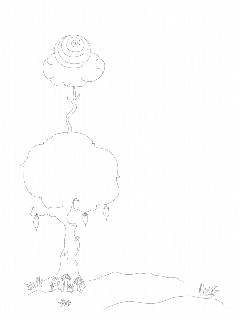 Spiral Tree with Lanterns and Mushrooms Coloring Page