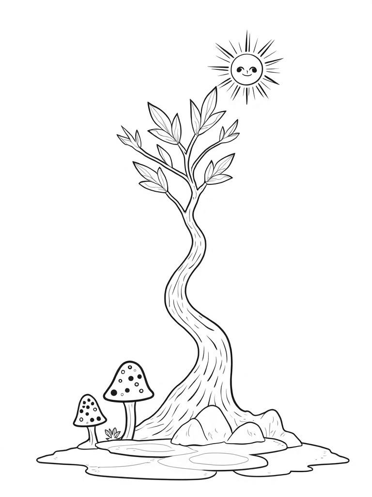 You’ll find a magnificent tree with a spiral trunk reaching high into the sky, its branches twisting like a tornado. Surrounding it are whimsical leaves shaped like musical notes that seem to dance in the breeze. At the base, oversized polka-dotted mushrooms peek out from the ground, adding a splash of fun to the scene.