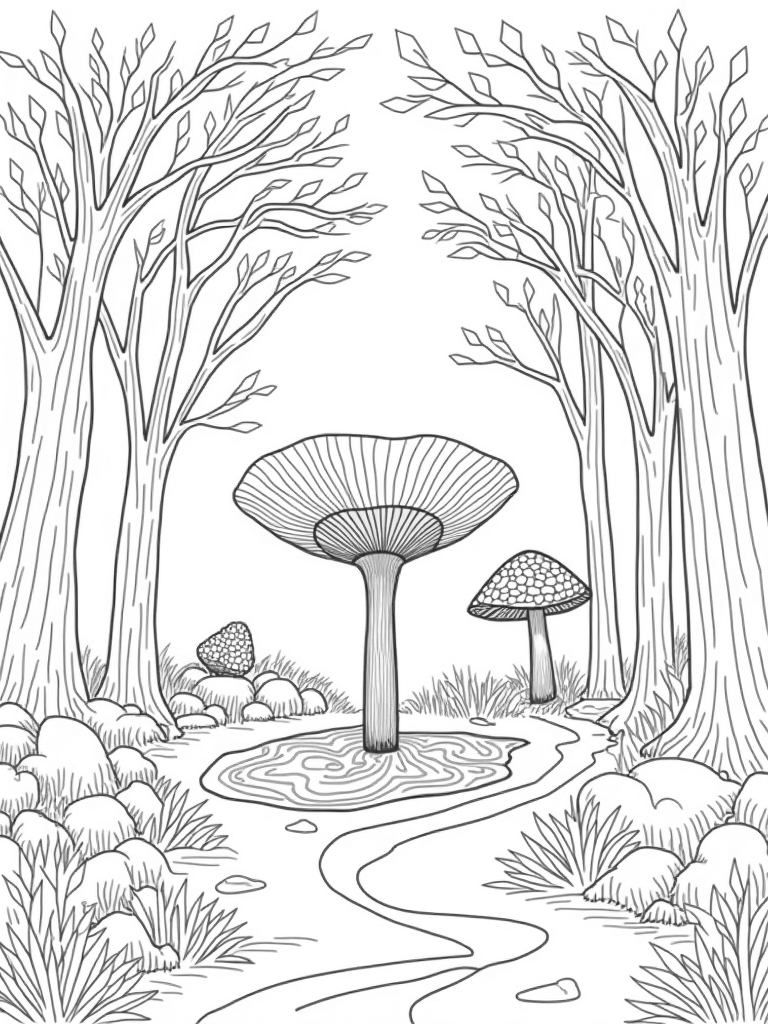 Check out this free, printable coloring page featuring a tranquil forest glade with spiral trees and a giant flower. Kids will love adding their own colors to this nature-themed scene!