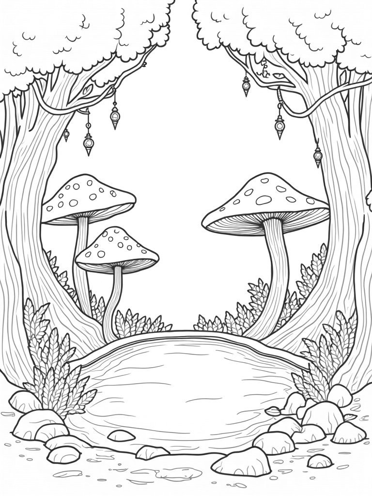 Towering Mushrooms and a Shimmering Pond Coloring Page