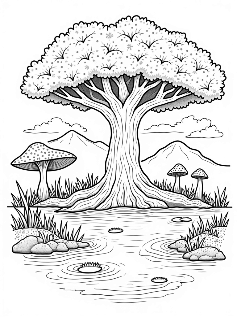 This coloring page showcases a magnificent tree with a sprawling canopy that creates a natural archway. Beneath this green wonder, a tranquil pond mirrors the tree's branches, complete with charming lily pads and flowers. You can also spot some oversized mushrooms nearby, each with its own quirky patterns just waiting for some vibrant colors.