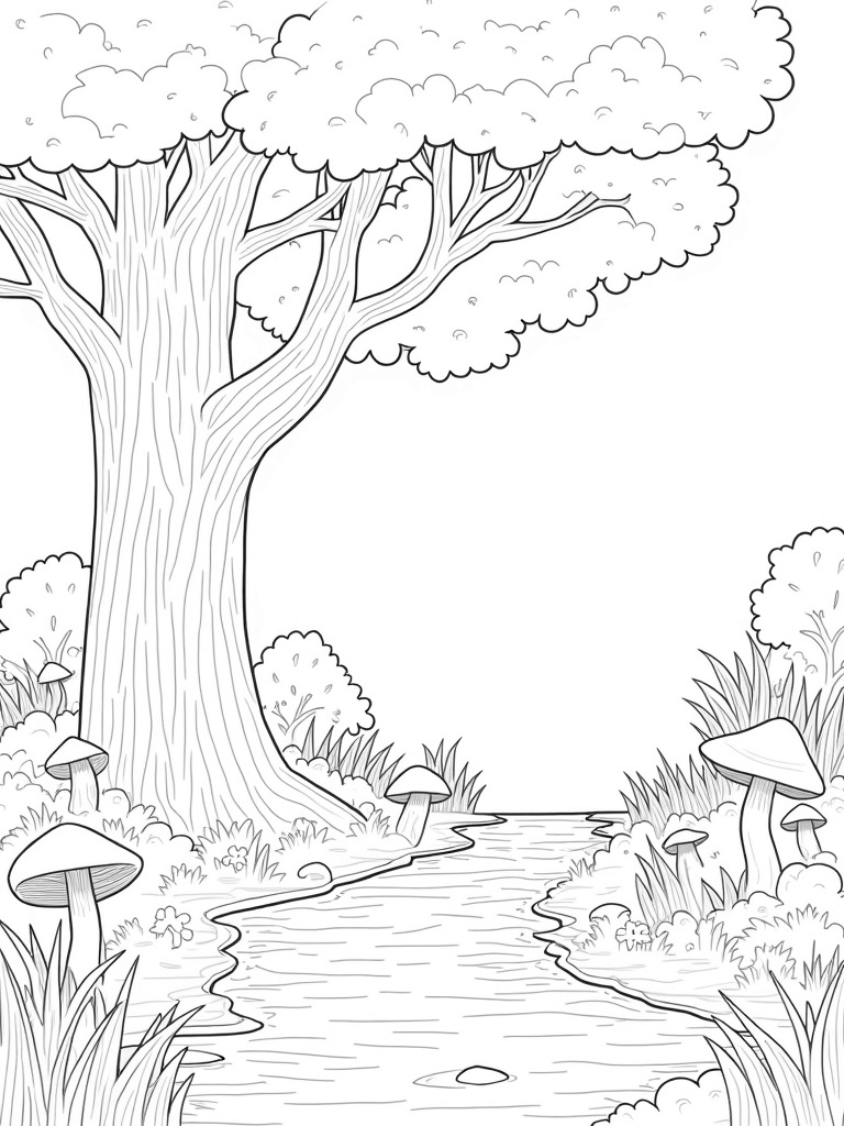 Surrounding the tree are some oversized mushrooms in all sorts of shapes and sizes, making the whole place feel whimsical and fun. Around their bases, delicate ferns are unfurling, adding a soft touch of green. And let’s not forget the gently flowing stream that meanders through, lined with smooth stones and colorful wildflowers blooming along the banks. It’s the perfect spot to let your imagination run wild while you color!
