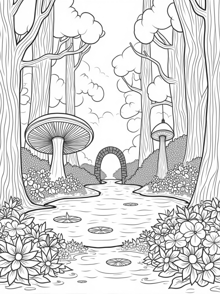 In this peaceful forest glade, towering trees with twisted trunks and oversized leaves create a cozy nook. At the heart of the scene, a giant mushroom stands tall, showcasing intricate gills and spiraling patterns that are just waiting for some colorful creativity. To one side, a beautiful pond reflects the sky, with floating lily pads adding a touch of charm. Nearby, a stone archway covered in vines hints at a hidden pathway lined with oversized flowers that burst with geometric shapes, making the whole place feel vibrant and alive.