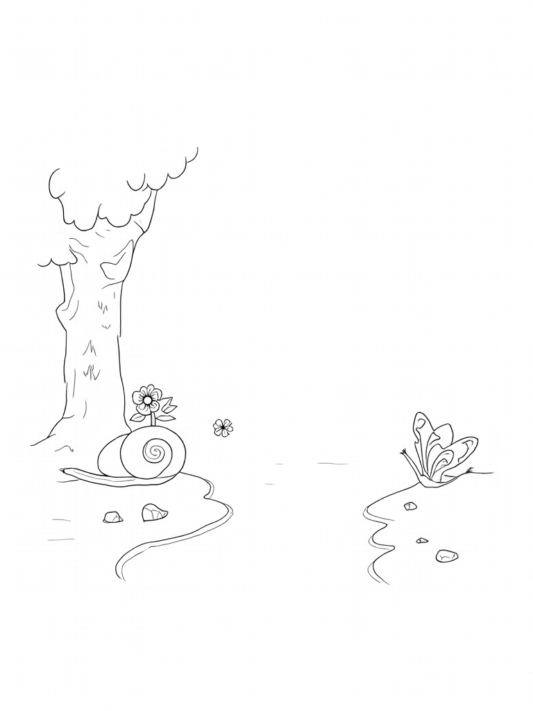 Tranquil Forest Glade with Snail Shell and Butterfly Coloring Page