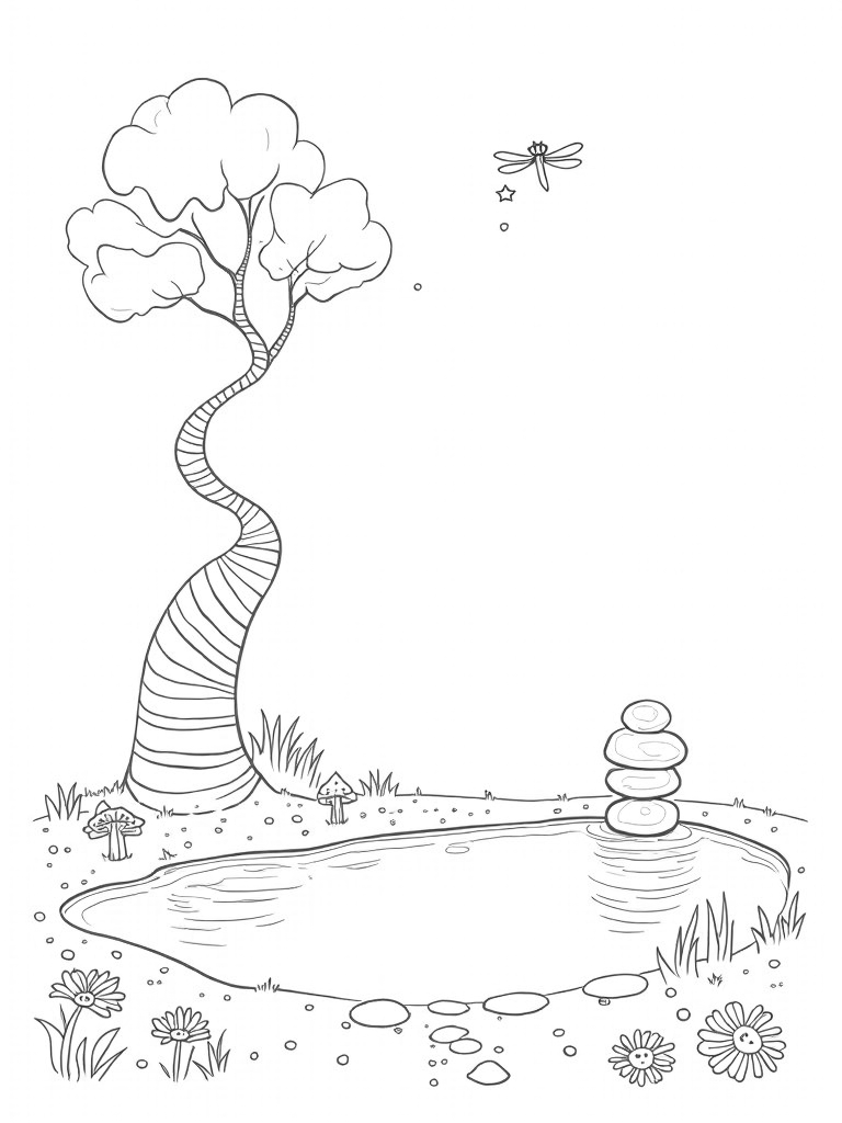 Check out this free, printable coloring page featuring a tranquil grove with a spiraling tree, vibrant flowers, and playful dragonflies. Perfect for kids who love nature, this coloring page will spark their creativity while they enjoy some relaxing coloring time.