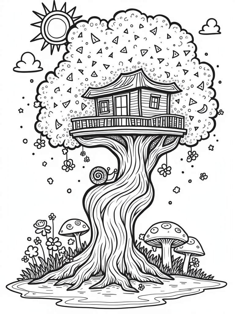 Treehouse in a Twisted Tree with a Snail and Flowers Coloring Page