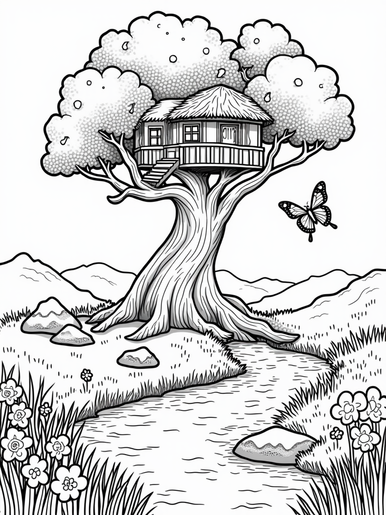 This coloring page shows a magical treehouse nestled high in a spiraling tree trunk. The branches are bursting with giant fruits that look like sparkling jewels! Down below, a friendly river winds its way through soft, green grass, with rocks shaped like smiling animals peeking out. It’s a place where imagination runs wild!