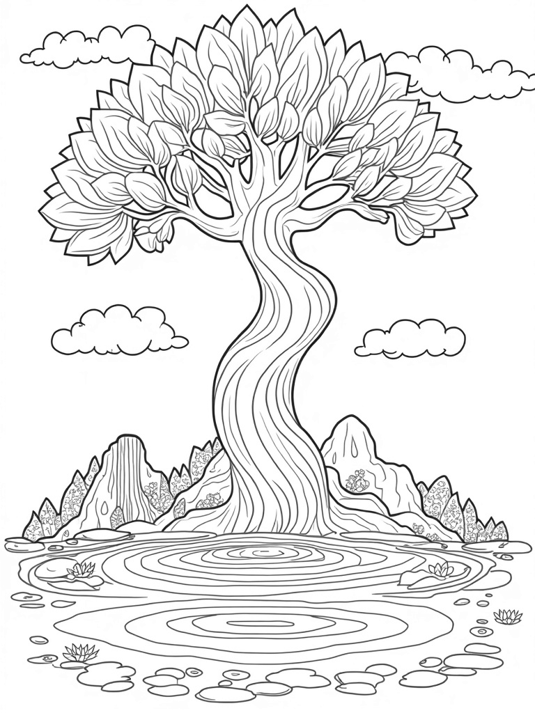 This coloring page showcases a giant, twisting tree that stretches its branches high into the sky. Each branch is decorated with oversized leaves in fun geometric shapes, making it a perfect canvas for your vibrant colors. At the base of the tree, you'll find a serene circular pond that beautifully mirrors the tree's unique silhouette. Dotted with lilypads and blooming water lilies, this pond adds a calming touch to the lively scene.