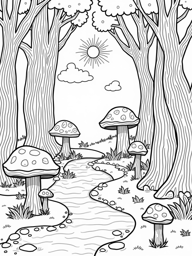 Twisting Trees and Playful Mushrooms in a Forest Coloring Page