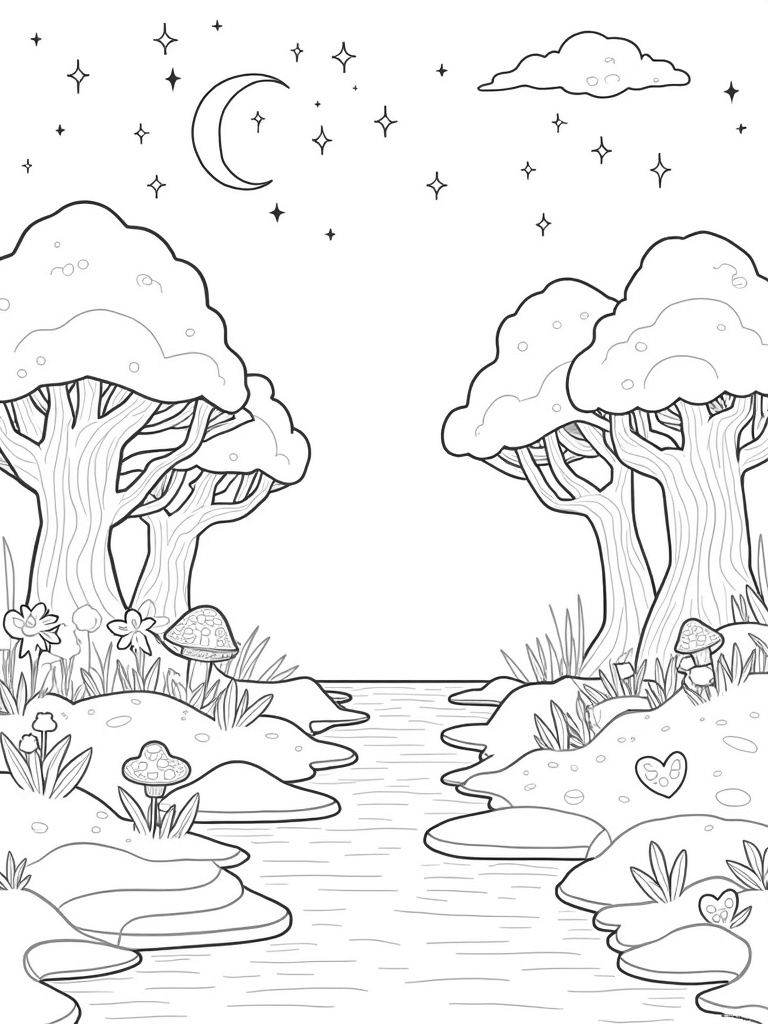 A gentle river flows through this enchanting forest, its surface shimmering under the moonlight. Along the riverbank, you'll find smooth stones shaped like hearts, perfect for imagining sweet little secrets hidden in this serene setting. The whole scene feels peaceful and inviting, making it a great spot for some coloring fun!
