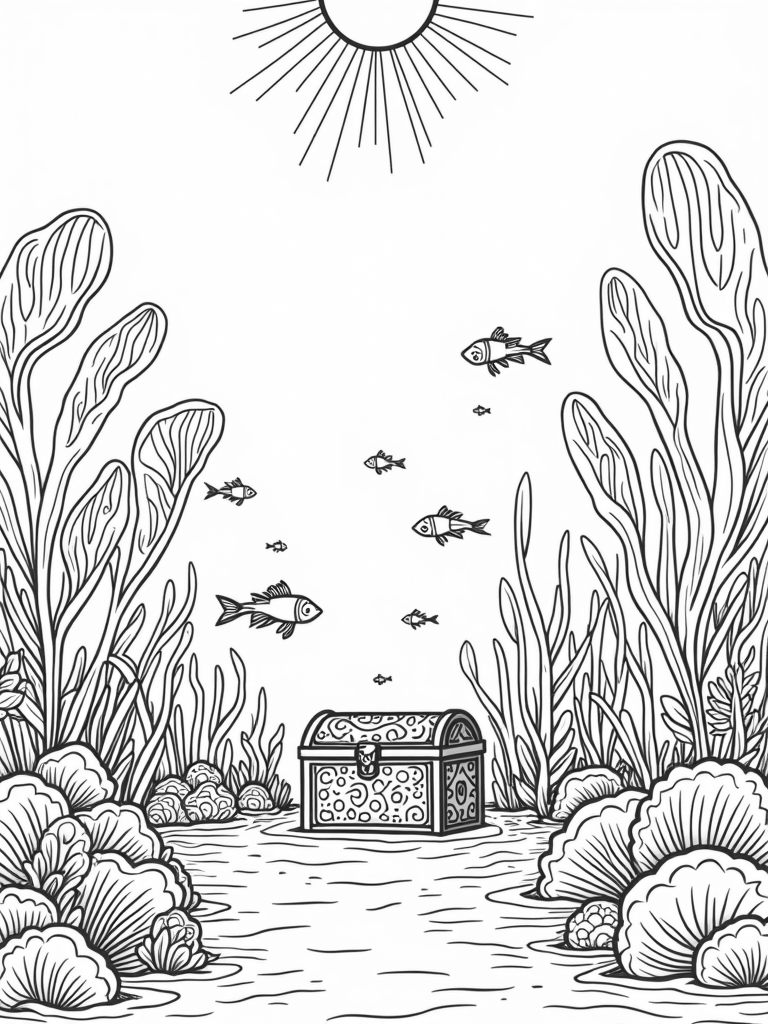 Look closely and you'll see a treasure chest tucked away on the sandy ocean floor. It’s beautifully designed and glowing under a giant sunbeam that filters down through the water. What do you think is inside? Maybe some sparkling jewels or secret maps to even more underwater wonders!